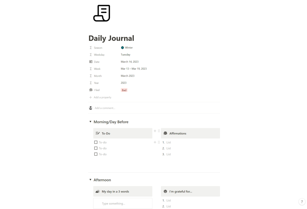 Say goodbye to scattered to-do lists and cluttered notes. The Notion Daily Journal template provides a simple and effective solution for keeping your life in order and staying focused on your goals.